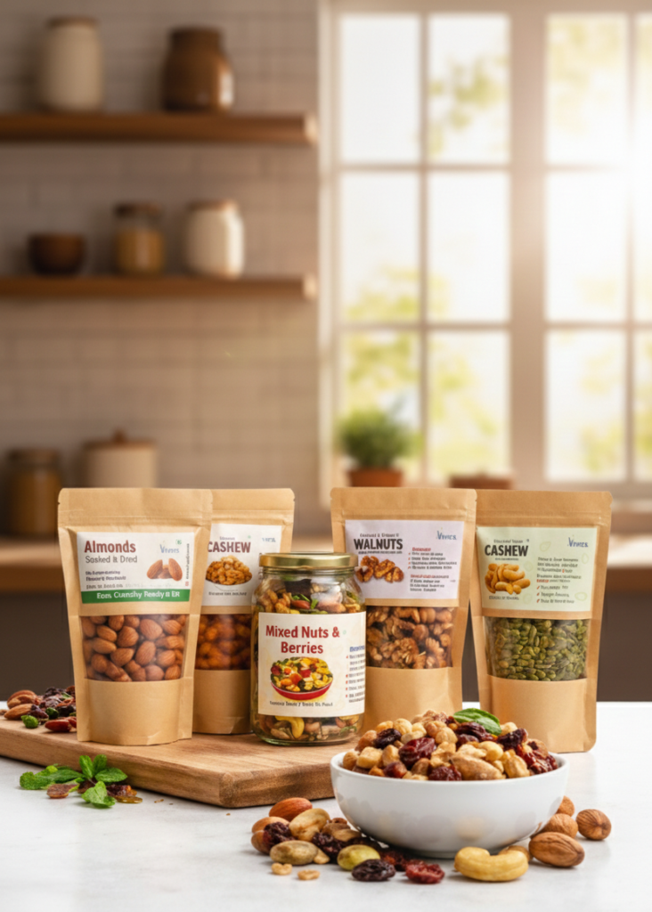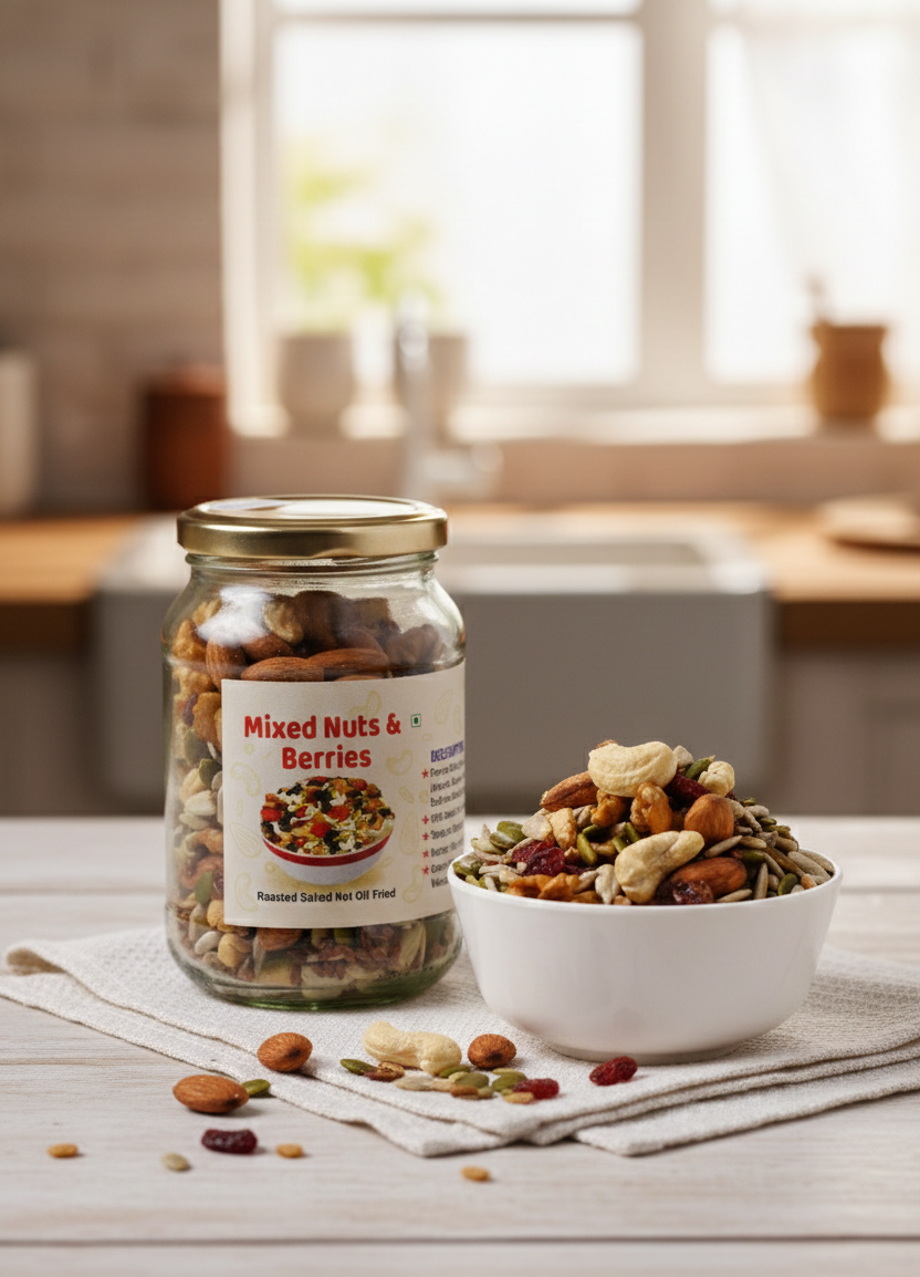 A balanced mix of nuts and berries, dry-roasted and lightly salted — never oil-fried.