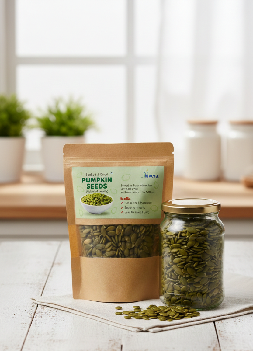 Mineral-rich pumpkin seeds, soaked and dried for enhanced bioavailability.