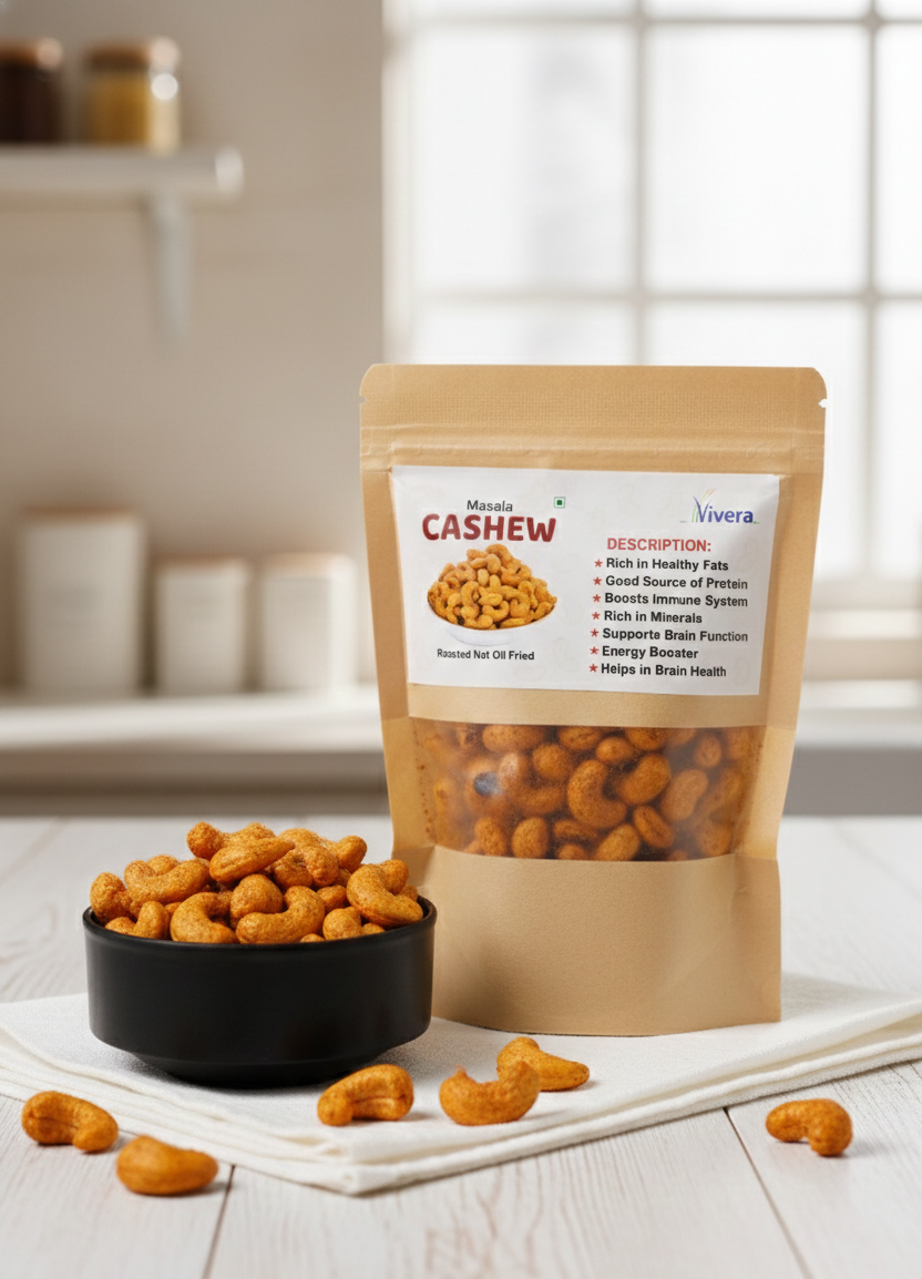 Spice-coated cashews, dry-roasted for bold flavour without oil.